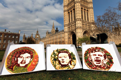 As part of the same campaign, the agency produced pizza portraits of the three main political leaders, with ingredients representing their characters. The Gordon Brown pizza includes fiery chilli and ground beef, David Cameron is represented by cheese and rocket, while Nick Clegg's pizza features fresh tomatoes and spicy sausage.